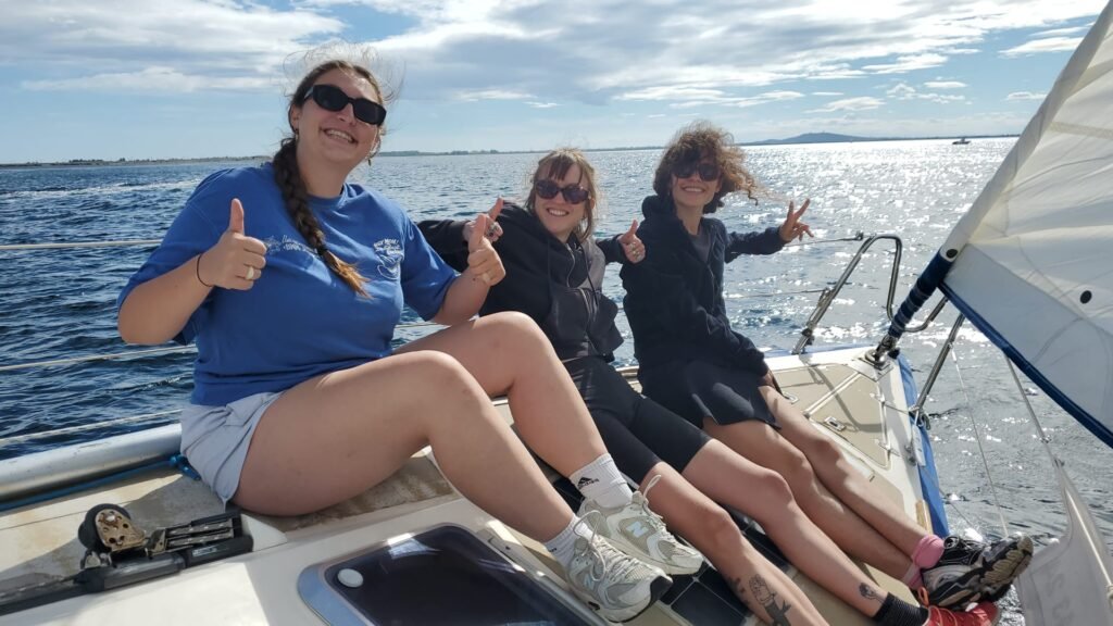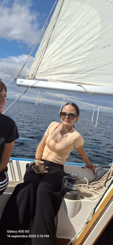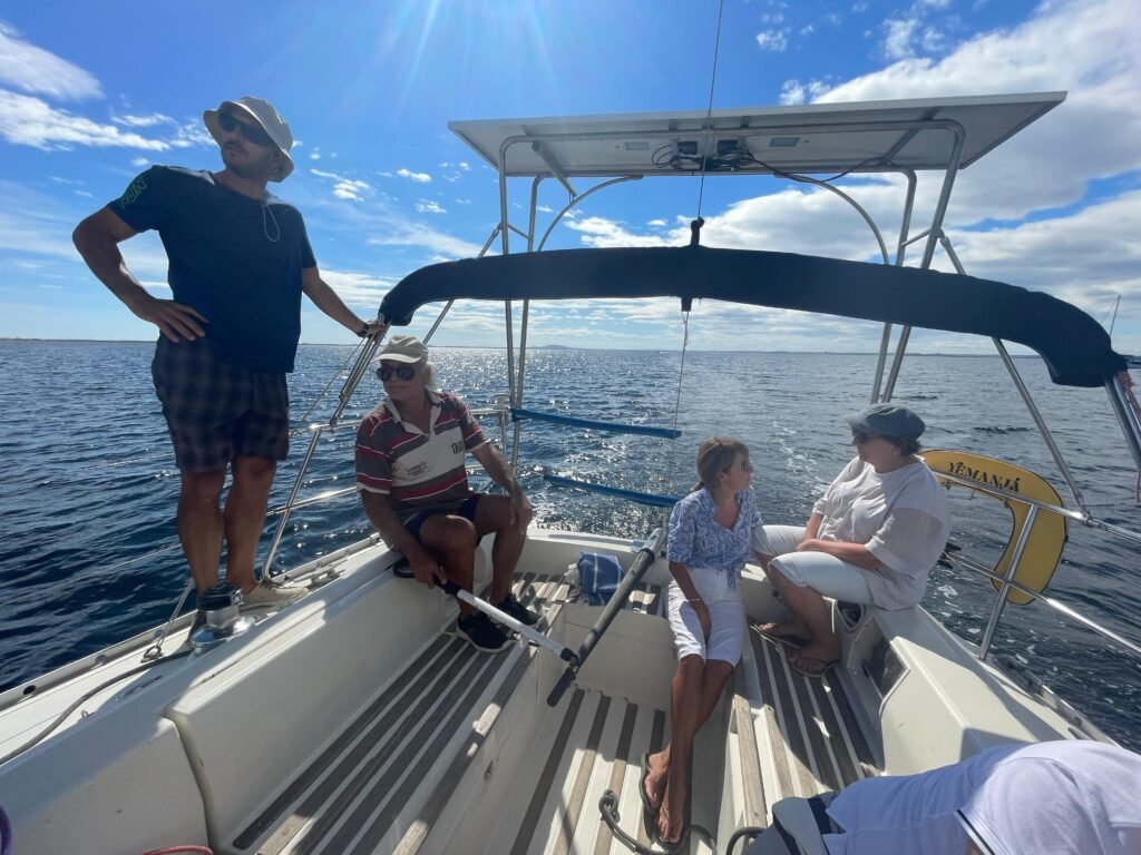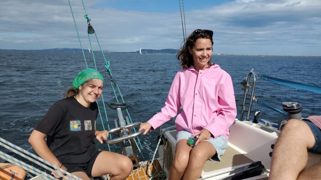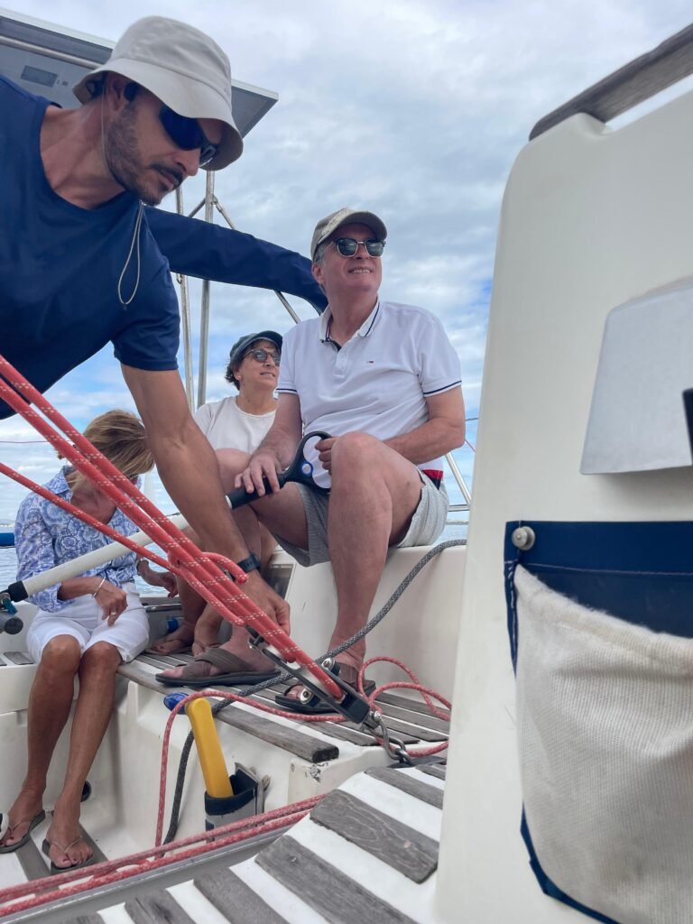 Un équipage venu découvrir Yémanjà et partager notre passion sur l’eau. Tous sont d’accords, il faut rester concentré à la barre !… mais pas trop, il faut aussi savoir profiter de ces derniers jours d’été et pourquoi pas d’une dernière baignade.