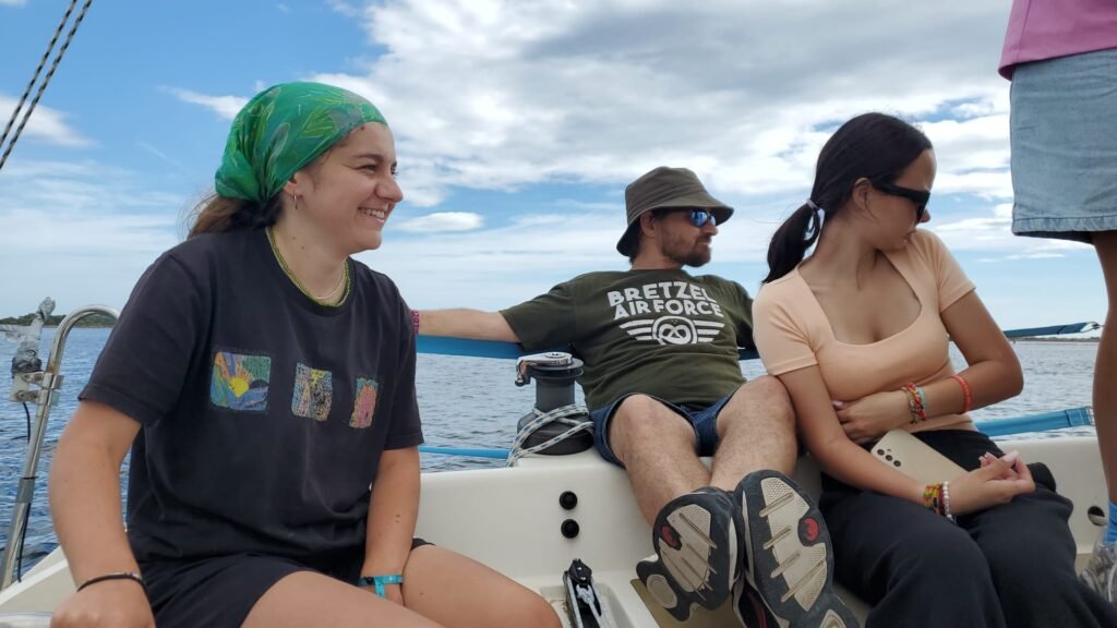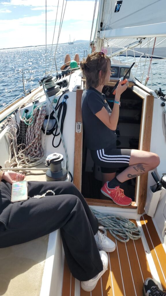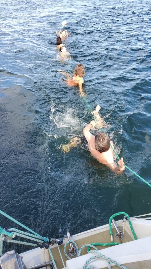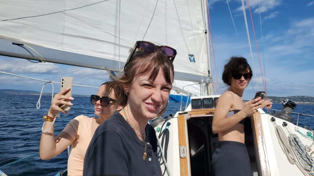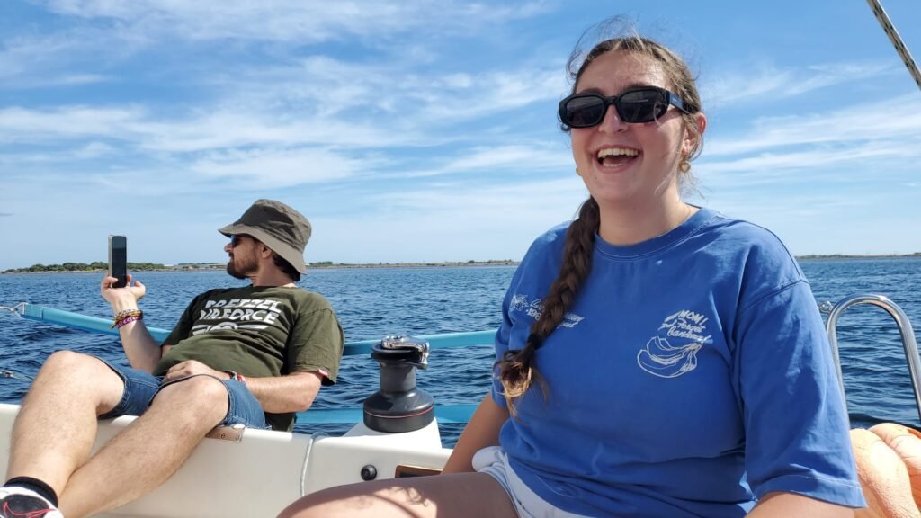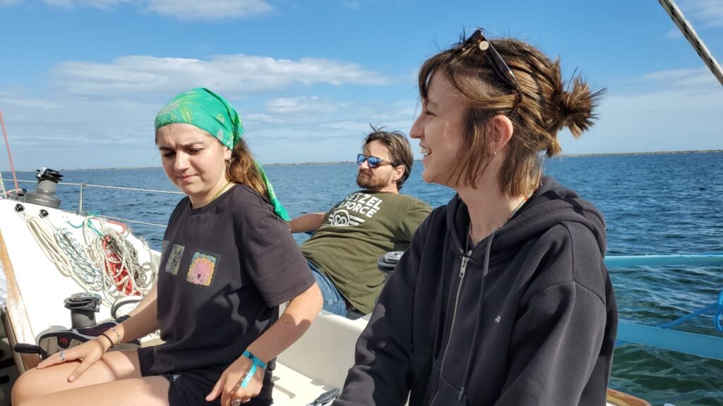 Un équipage venu découvrir Yémanjà et partager notre passion sur l’eau. Tous sont d’accords, il faut rester concentré à la barre !… mais pas trop, il faut aussi savoir profiter de ces derniers jours d’été et pourquoi pas d’une dernière baignade.
