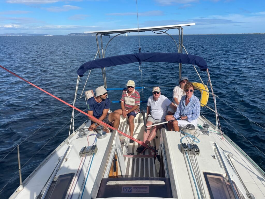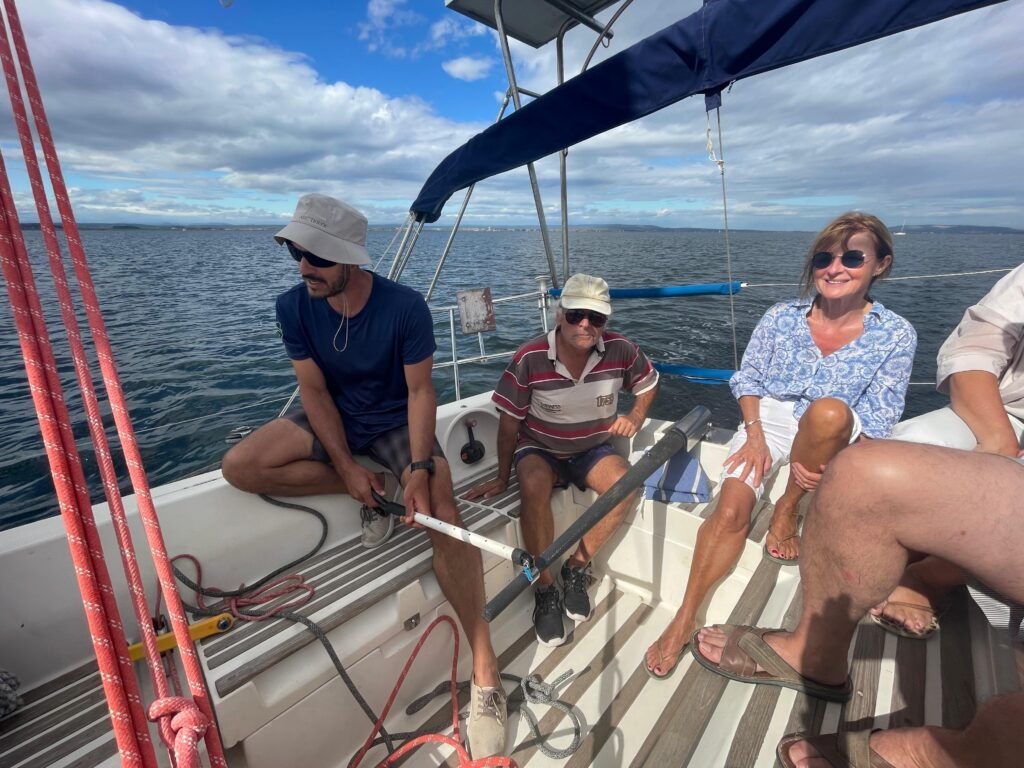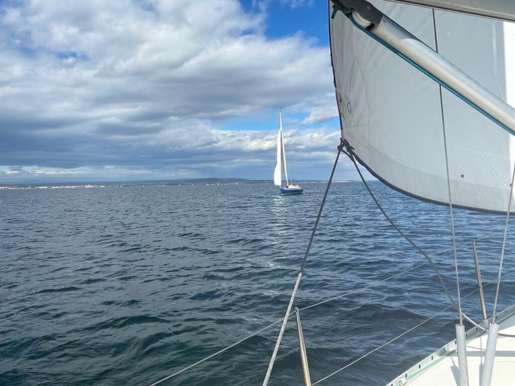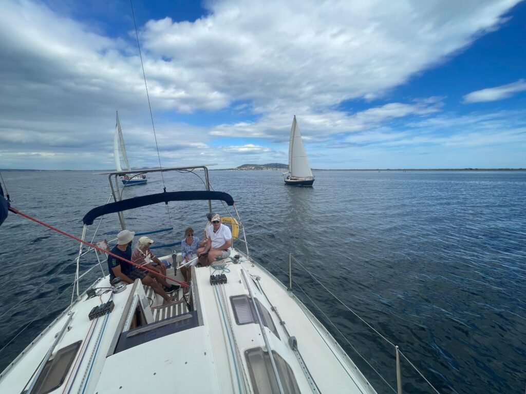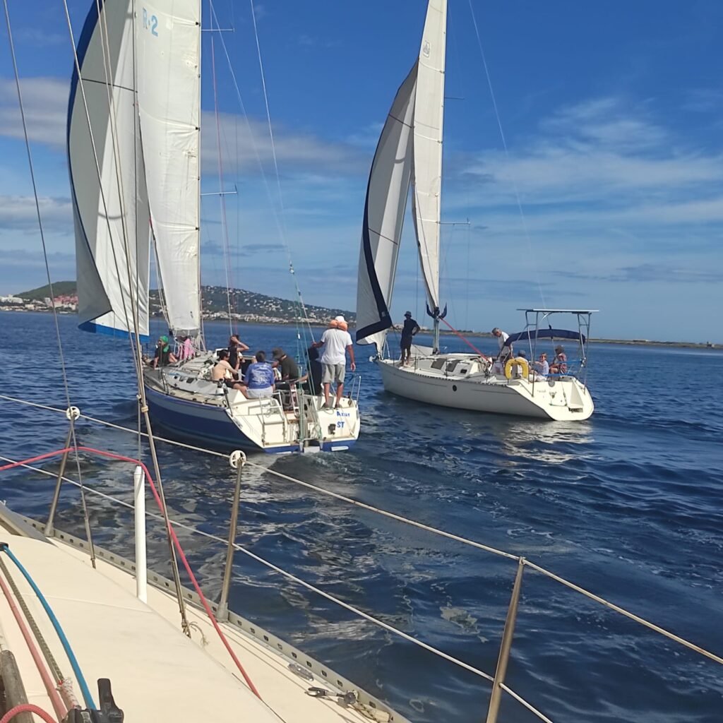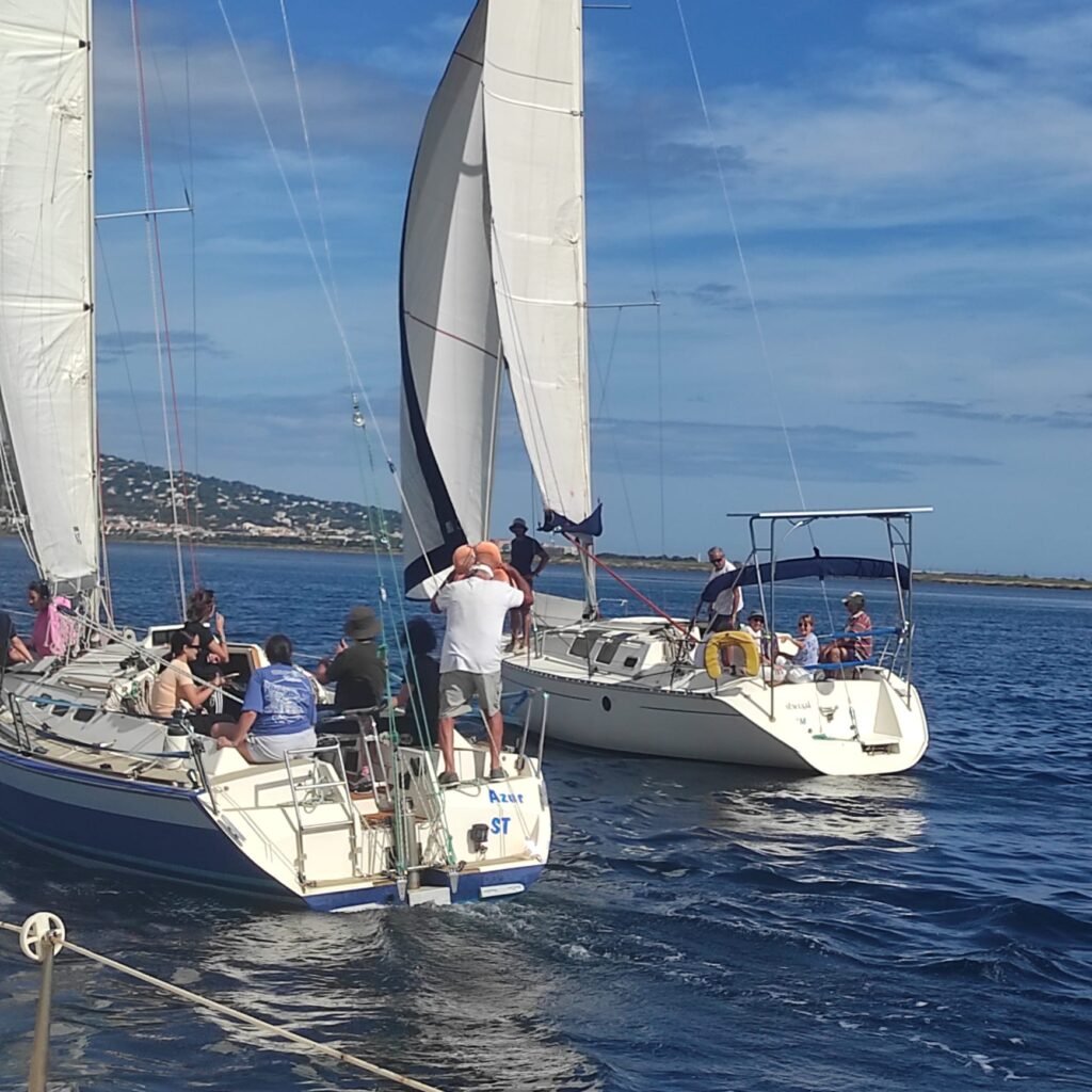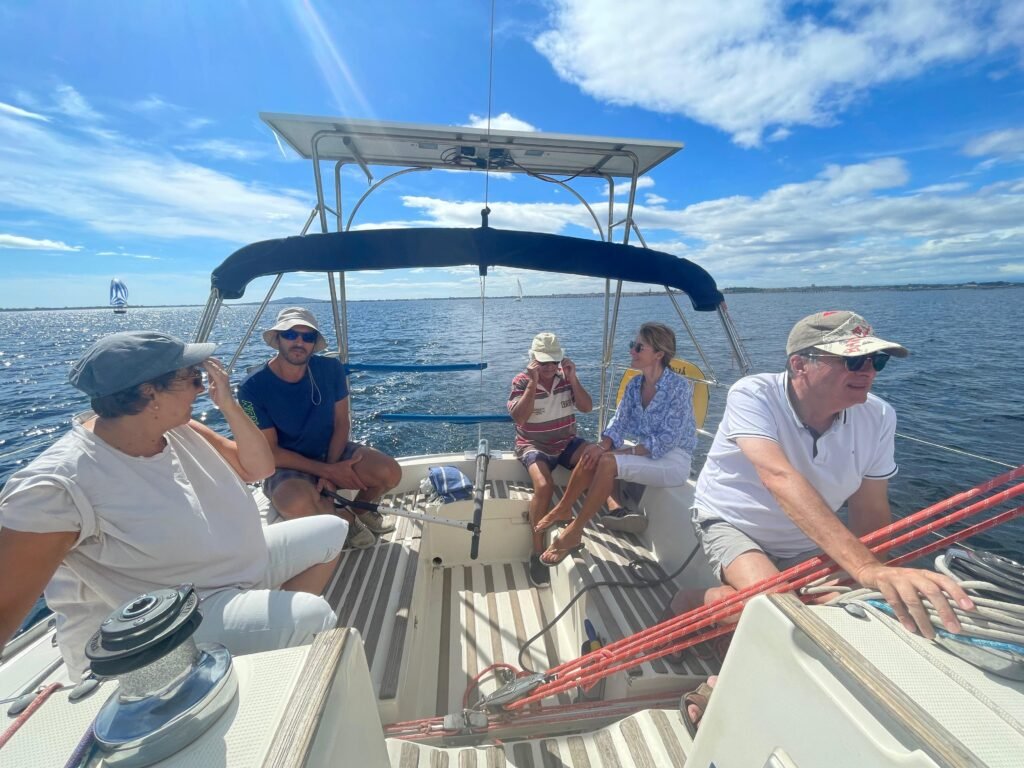Et oui quatre voiliers de L’Amicale sur la Lagune qui prendront plaisir à se retrouver. Sur Azur l’équipage en découverte pour certaines, barre, virements et réglages, routes au prés, travers et largue pour terminer par le bain tracté ! Un équipage très volontaire que nous retrouverons sur les voiliers de l’Amicale, c’est certain ! Le verre amical sera bien évidemment partagé pour clôturer cette super sortie.