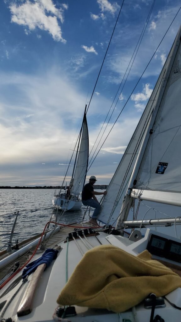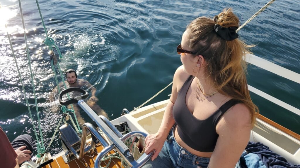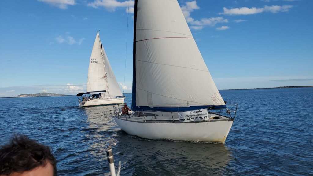 Il fait bon être jeune dira Albert sur Azur!.Son équipage profitera d’un ballet orchestré « sans » vent avec les voiliers de l’Amicale, Thicar et Aloha3 pour plonger et pousser, (hum) le voilier. Très beau temps, des eaux pas trop chaudes? Le temps de remonter se sécher et voir de légères brises arriver. La sortie voile est sauvée, L’équipage enchaînera de nombreuses manœuvres de petit temps avant le retour au port. Un régal affirmera l’équipage lors du partage du verre amical. A bientôt.