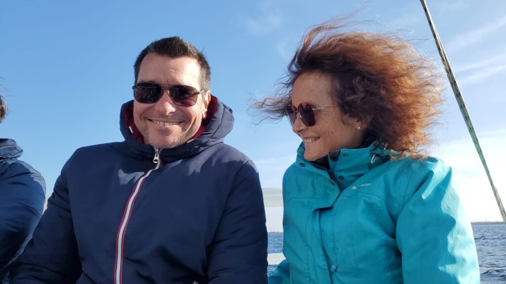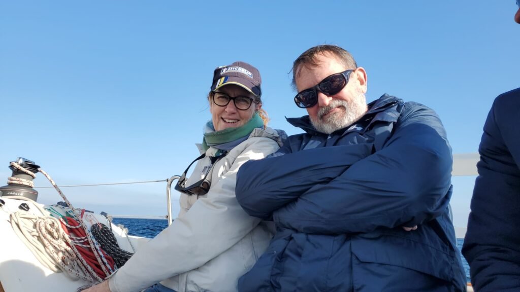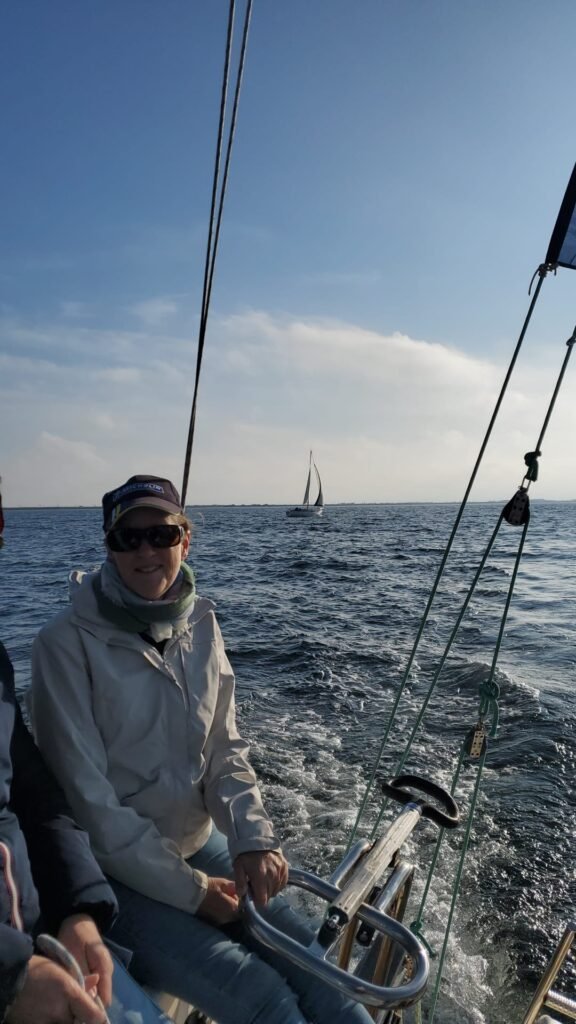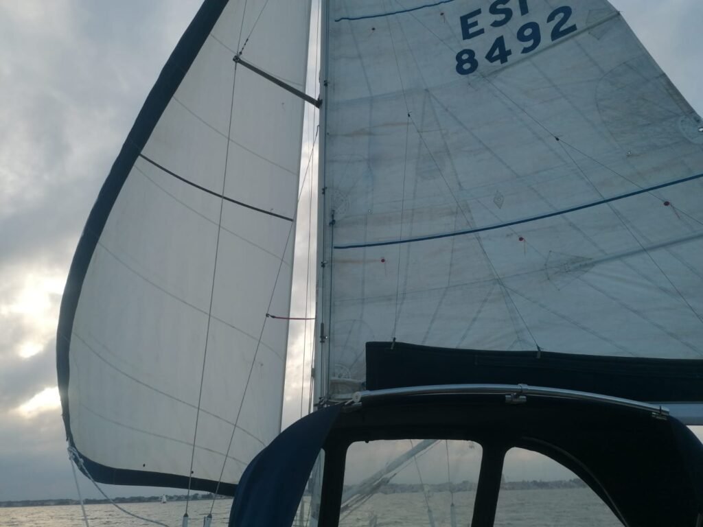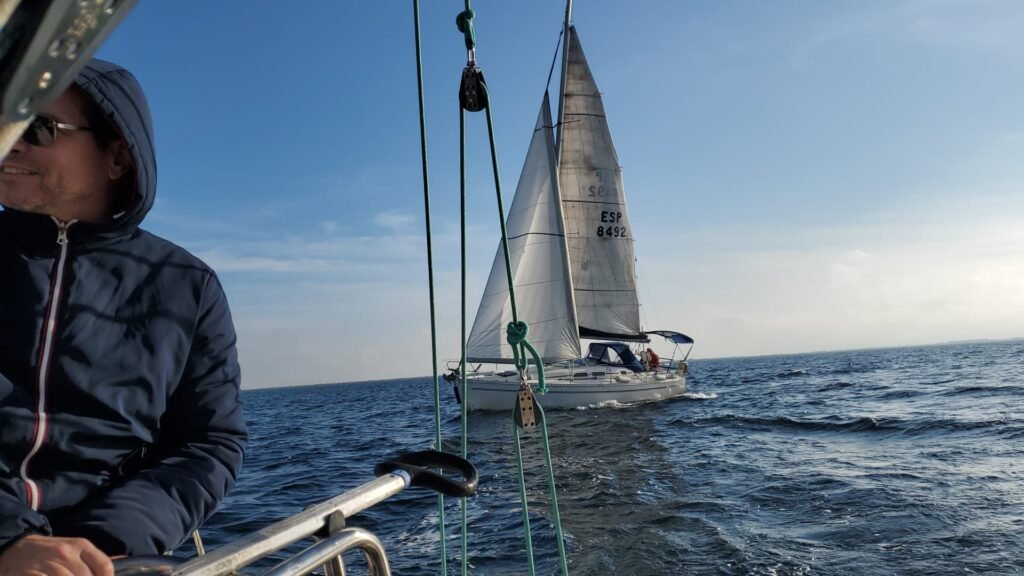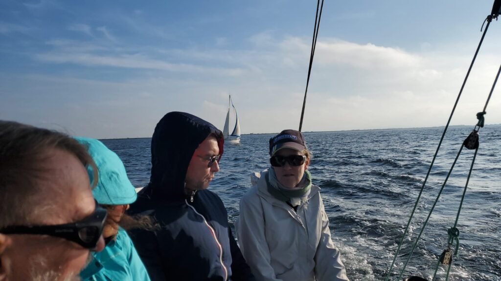 Virement de bord et retour au largue en envoyant la GV et Génois réduit de 20%seulement, pour finir voiles en ciseaux pour permettre aux barreurs d’apprendre à maîtriser sa route! Pas tjrs facile.