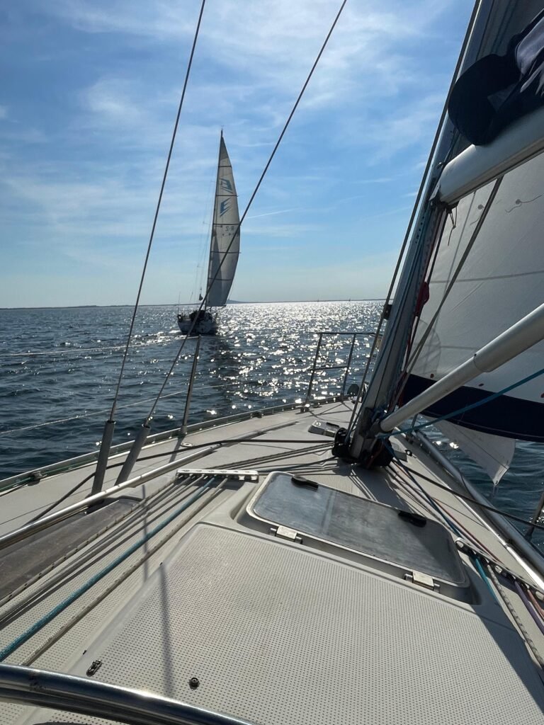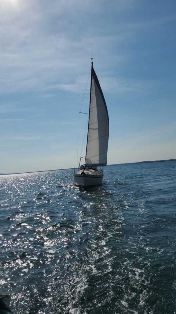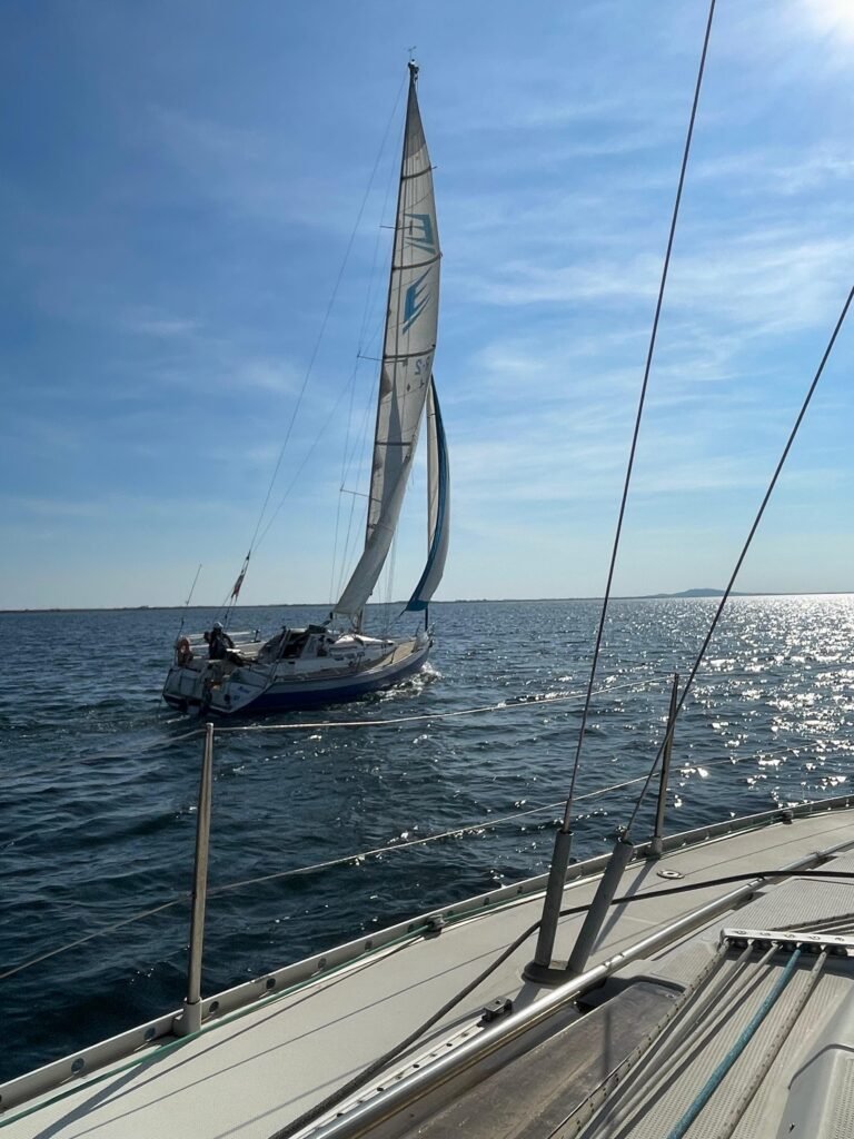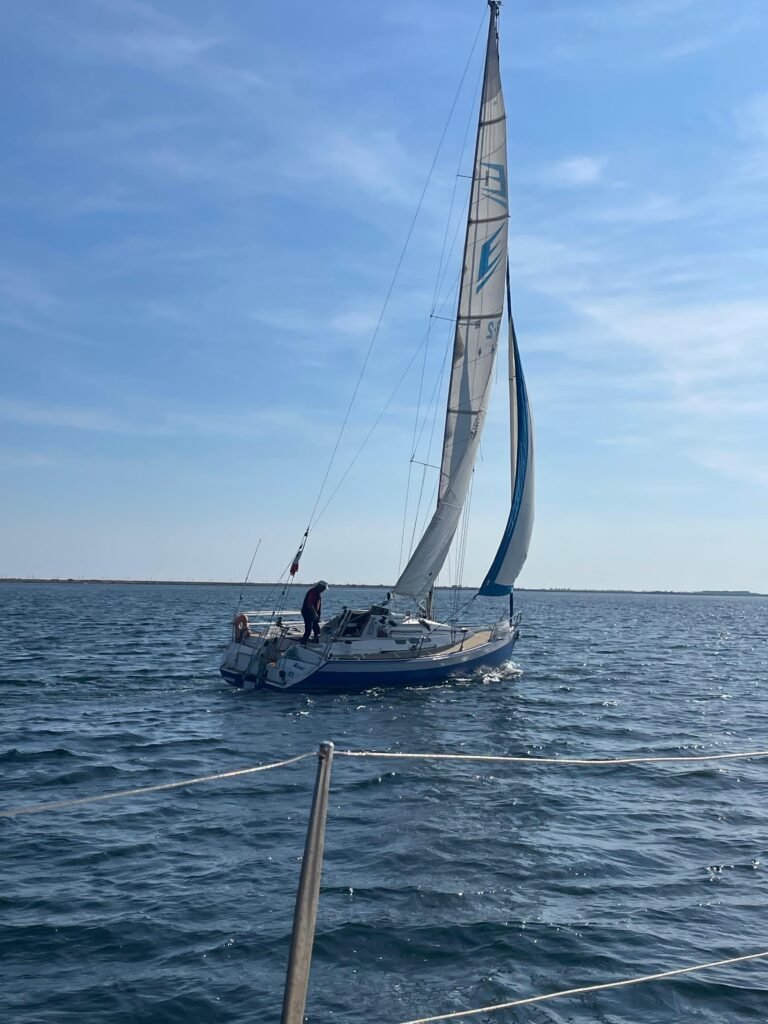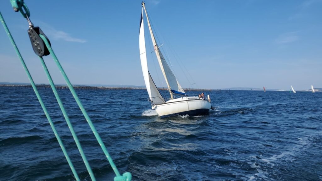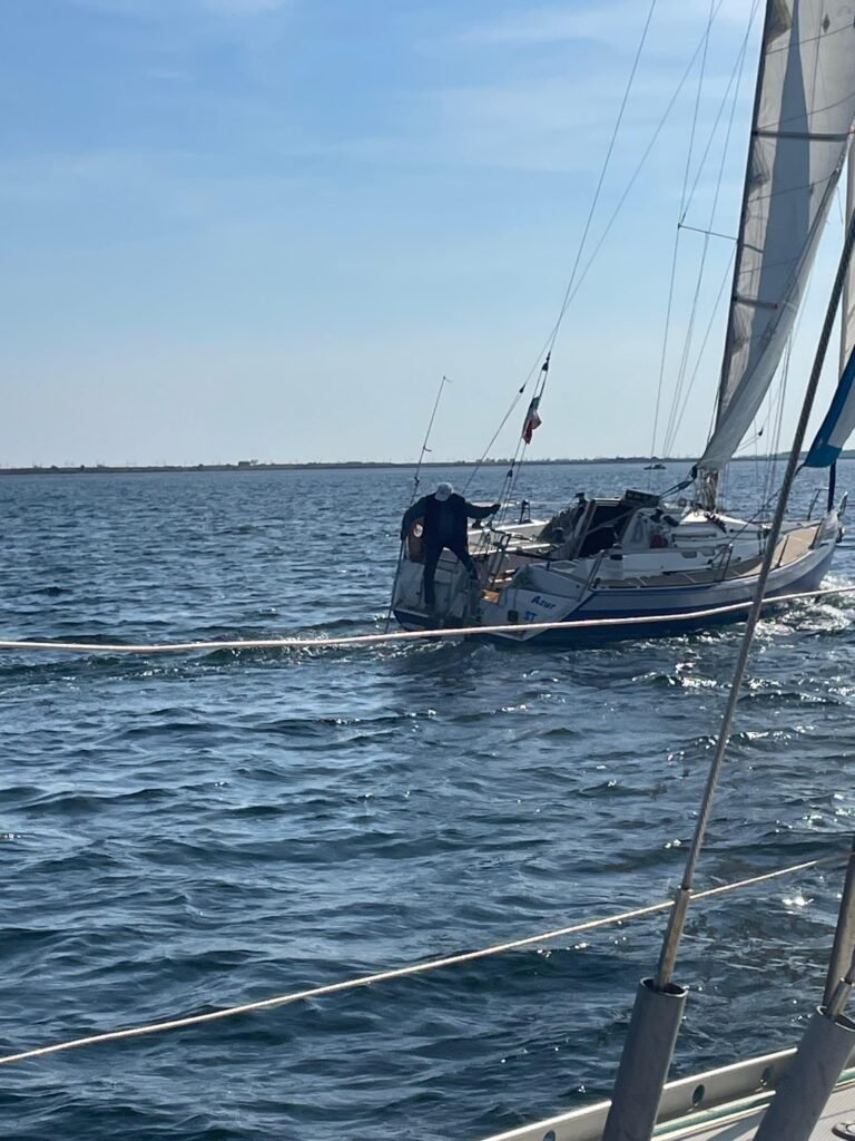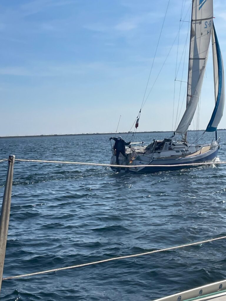 Bonne pêche pour Azur ! Une écoute de génois sans nœud de huit au bout, elle part à l’eau et c’est gagné pour bloquer le moteur…la sortie voile sera sympa au milieu de nombreux voiliers de l’amicale. Retour au port sous voile et Ithaque viendra remorquer Azur pour les derniers 50 mètres, merci à tous.