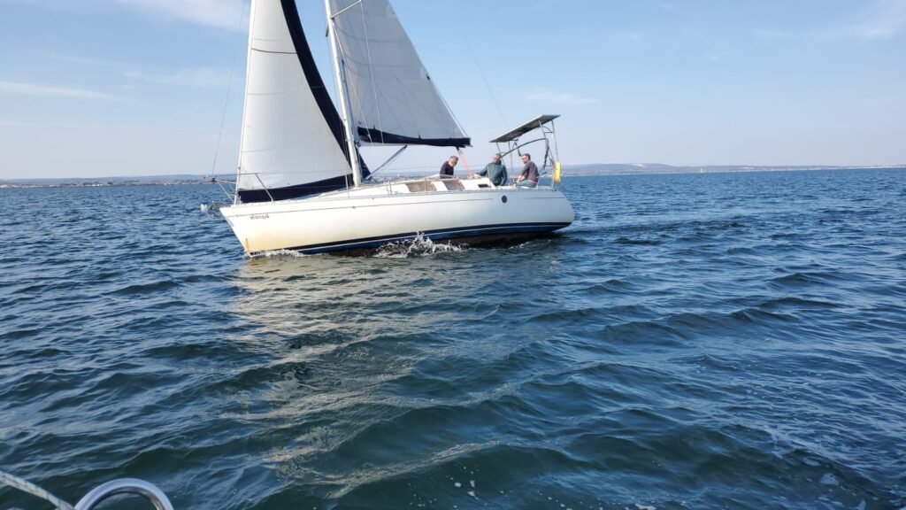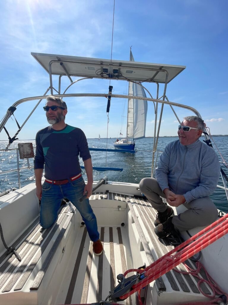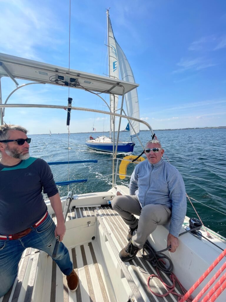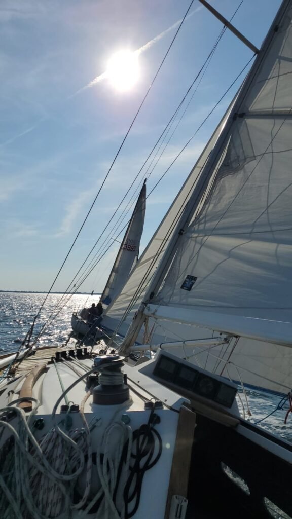 Vent de Sud 7 à 12 nds. Belle sortie pour Yémanjà qui ira croiser quelques bateaux de l’amicale bien représentés sur l’eau ce jour, Ithaque, Azur, Caprice… Nous surprendrons le chef de bord d’Azur en train de pêcher avec sa gaffe un drôle de poisson. Ses déboires sont à lire plus loin. Beaucoup seront réunis à bord pour partager une boisson après cette belle sortie de printemps.