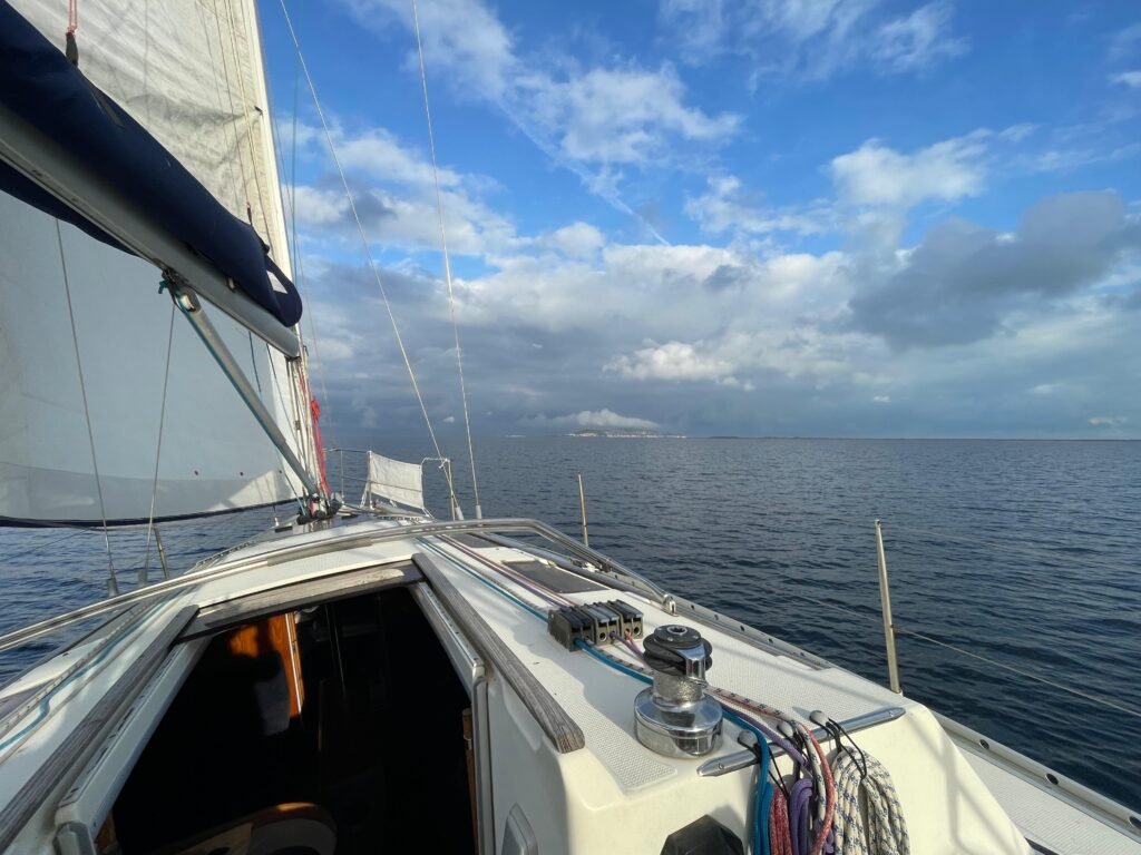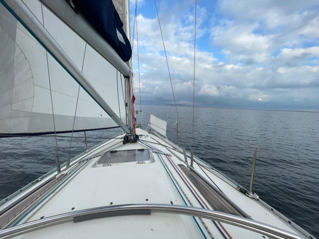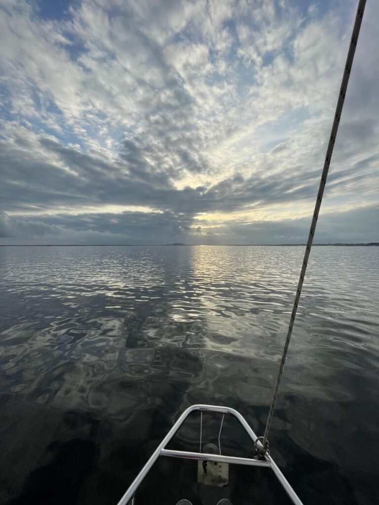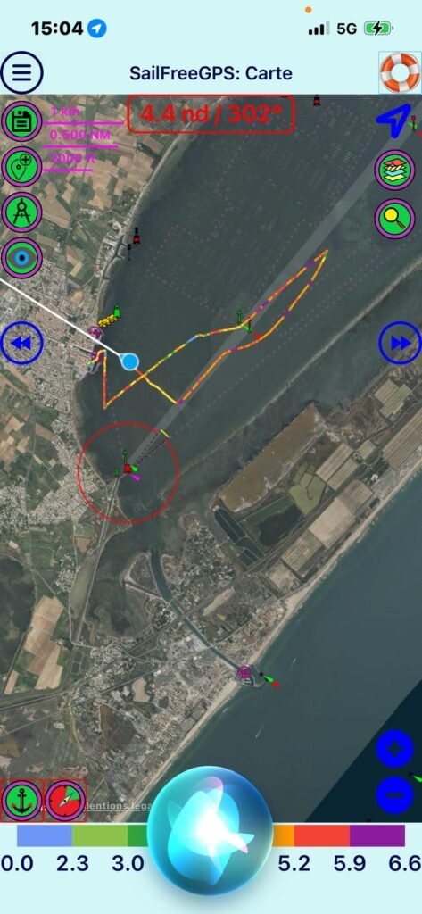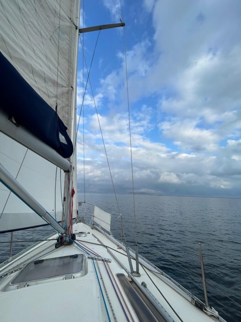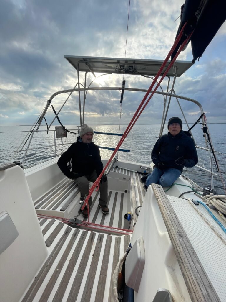 Vent de SSE 8 à 12 nds mollissant à pétole, « Moteur » 🎬 🎬 en fin de parcours. Nous montons vers Mèze et croisons Aloha3 qui sera moins patient que nous pour faire appel à son Diesel. Le temps d’une boisson chaude au milieu de la lagune sans en renverser une goutte, de ranger les voiles et direction le port !