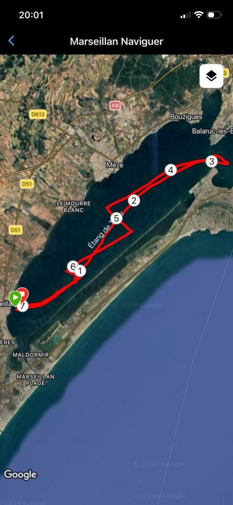 Pour la direction et la force du vent chacun choisira car impossible à définir notamment au départ de Marseillan en direction de Sète impeccable vent régulier pour le retour également sauf à nouveau devant Marseillan . L’équipière du jour a bien géré malgré ce vent capricieux. Une belle journée de printemps.