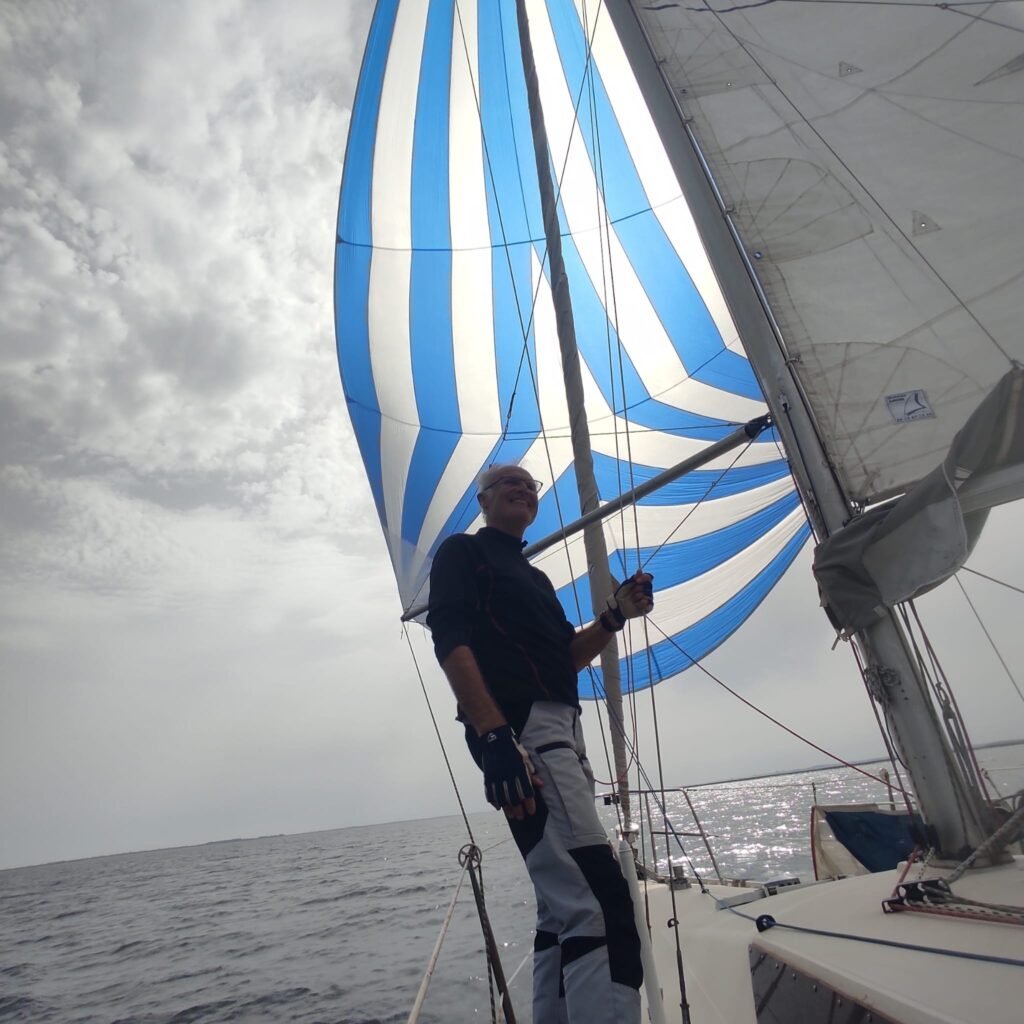 Sortie d’Ithaque sous un beau soleil 🌞. 12/14 noeuds de Vent d’Est comme hier. 2 ris à la grand voile 2/3 de génois. L’ équipage fait plusieurs virements et empannages pour se familiariser avec le voilier. Le CVM et les Glénans sont de sortie. Encore un bel après-midi sur l’eau.