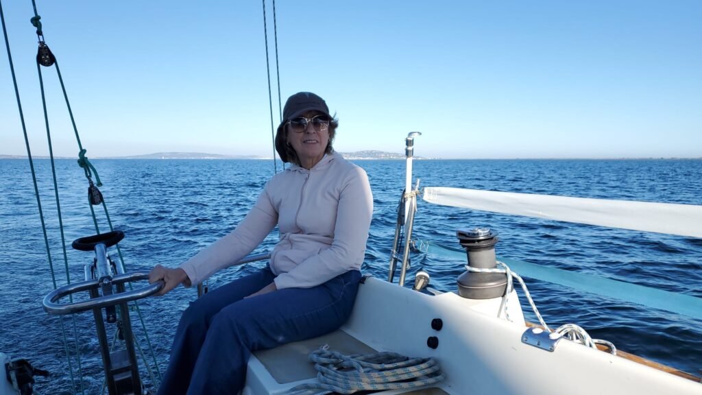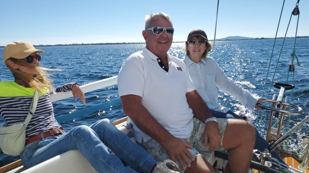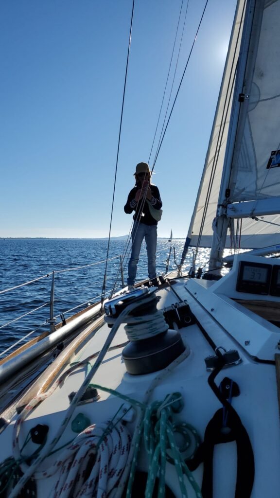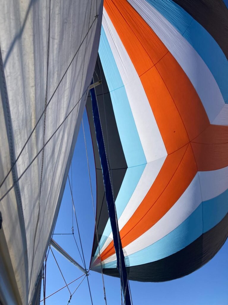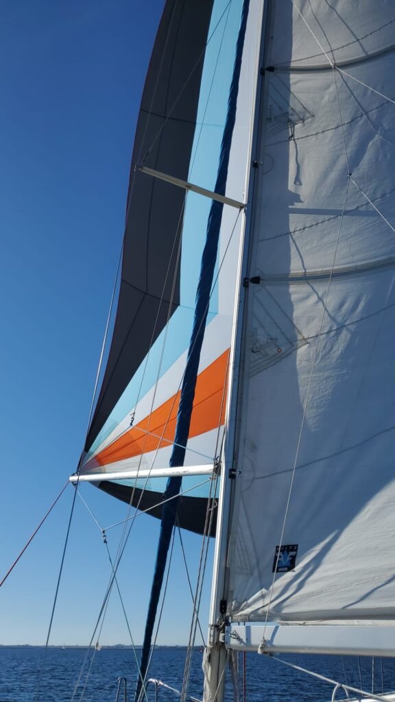 Que du plaisir sur Azur avec un équipage qui met les mains à la patte pour gréer et envoyer le spi! Félicitations à nos deux équipières qui en sont au tout début. Mention + pour notre équipier qui lui est un « pro » en herbe …pour son deuxième envoi. Deux équipiers ont déclaré forfait vers 14hrs, panne de voiture, dommage !