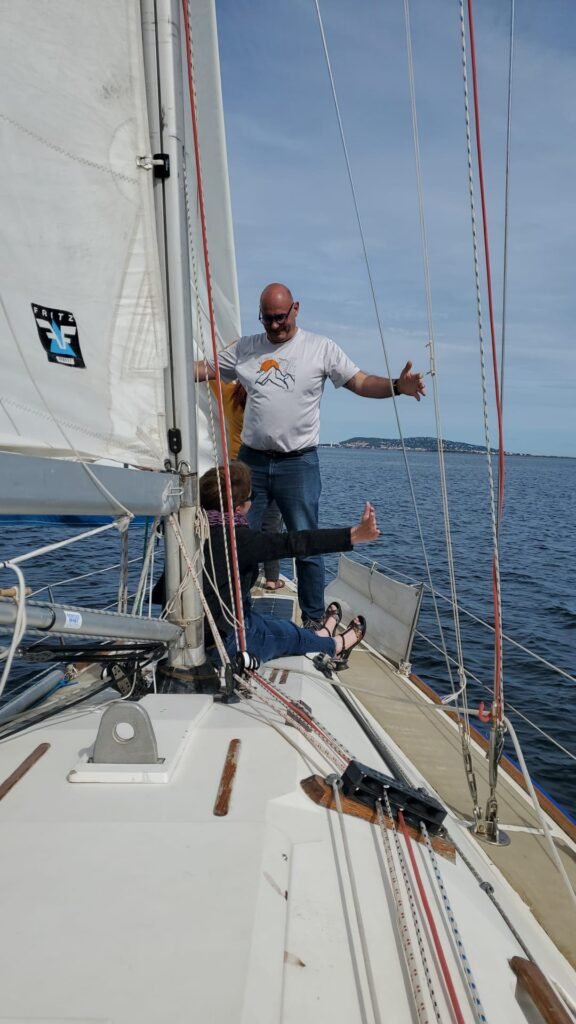 Un bord de largue pour déborder Listel, à chacun son tour de barre sinon la sanction tombe : l’équipière où l’équipier passe à l’eau! Pas de sanction aujourd’hui, dommage…..l’eau doit être encore bonne?