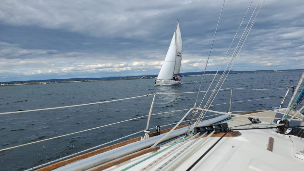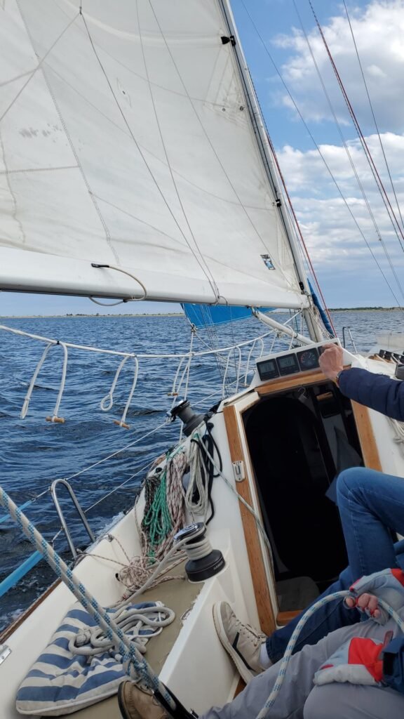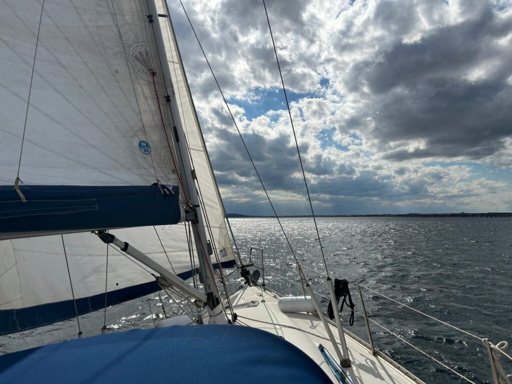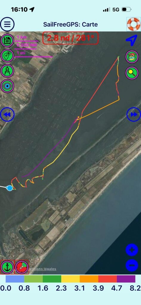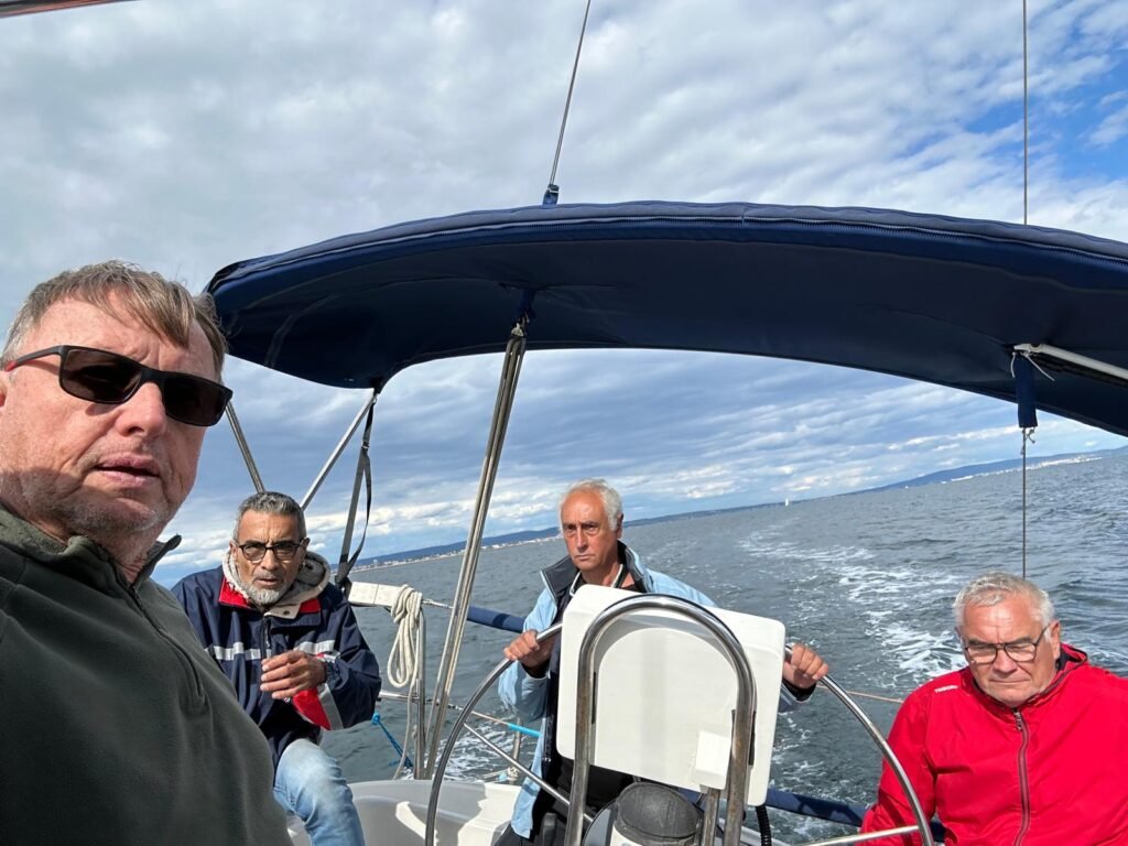 Une sortie avec Azur sous le signe de vents très très variables en force et en direction ce qui fera le bonheur de l’équipage et principalement des barreurs, toujours en action ! De nombreux virements et un retour des parcs de Bouzigues avec un petit S excellent de 14nds. Contact vhf avec Thicar et croisement avec Aloha3.