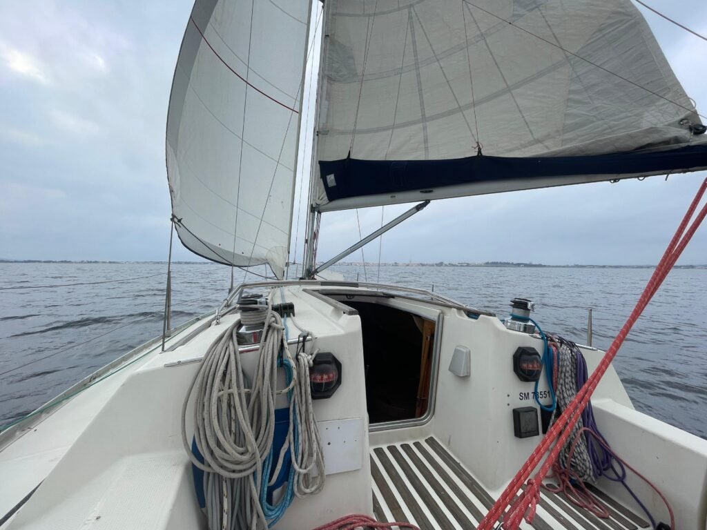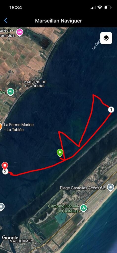 Vent d’Est tournant Sud Est 8 à 14 nds. Quelques virements de bord sous un ciel bien mausade pour arriver à mi-chemin de Mèze, puis un joli retour au portant jusqu’à Marseillan. Deux bateaux sur l’eau, Yémanjà comme l’unique représentant de l’amicale, les autres ont sûrement préféré rester au chaud ☕️ ! Silence VHF constaté ! 😁